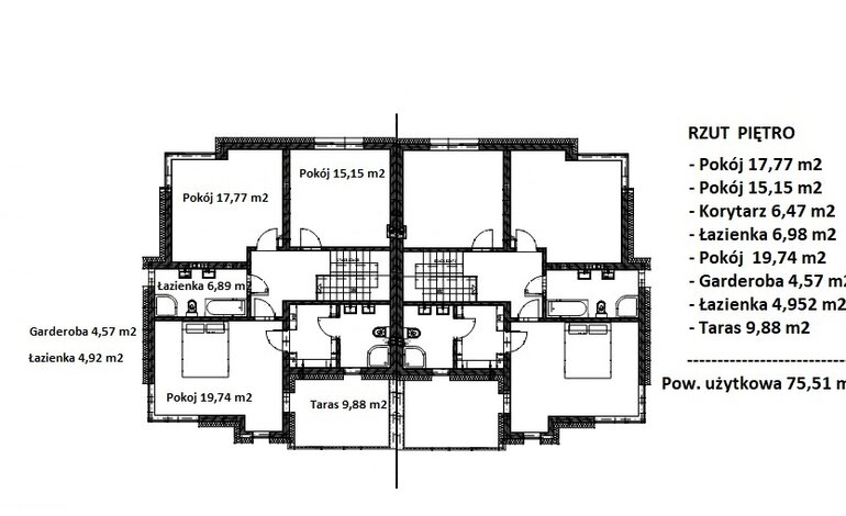Na piętrze znajdują się trzy pokoje ( 17,77; 15,15; 19,74), korytarz 6,47 m2, łazienka 6,89 m2; garderoba 4,57 m2; łazienka 4,92 m2, taras 9,88m2